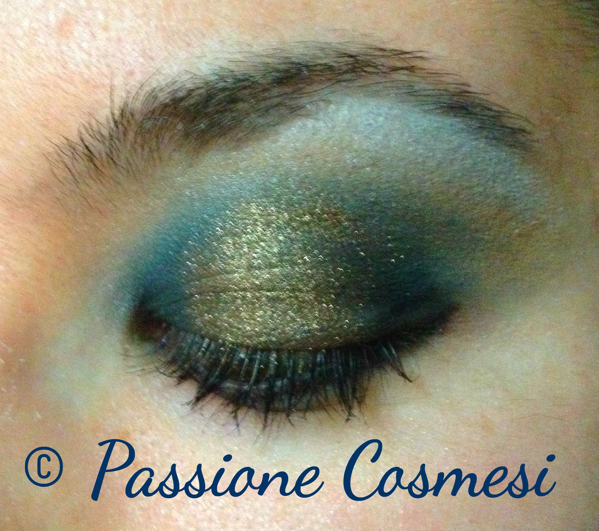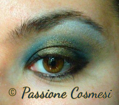 Per fare questo, ho realizzato questo trucco sugli occhi, tenendo sempre come colore chiave l'oro. Ho iniziato stendendo un buon primer, per poi applicare su tutta la palpebra mobile un ombretto blu petrolio che ho sfumato verso l'esterno. Ho preso poi un ombretto bianco leggermente pigmentato di azzurro chiaro molto freddo, con cui sono andata a creare il punto luce sotto il sopracciglio e nell'estremità interna dell'occhio. Per completare il lavoro sulla parte superiore dell'occhio, ho steso al centro della palpebra dei pigmenti oro, sfumandoli verso l'alto. Per quanto riguarda la rima inferiore, ho passato una matita nera sia internamente che esternamente.