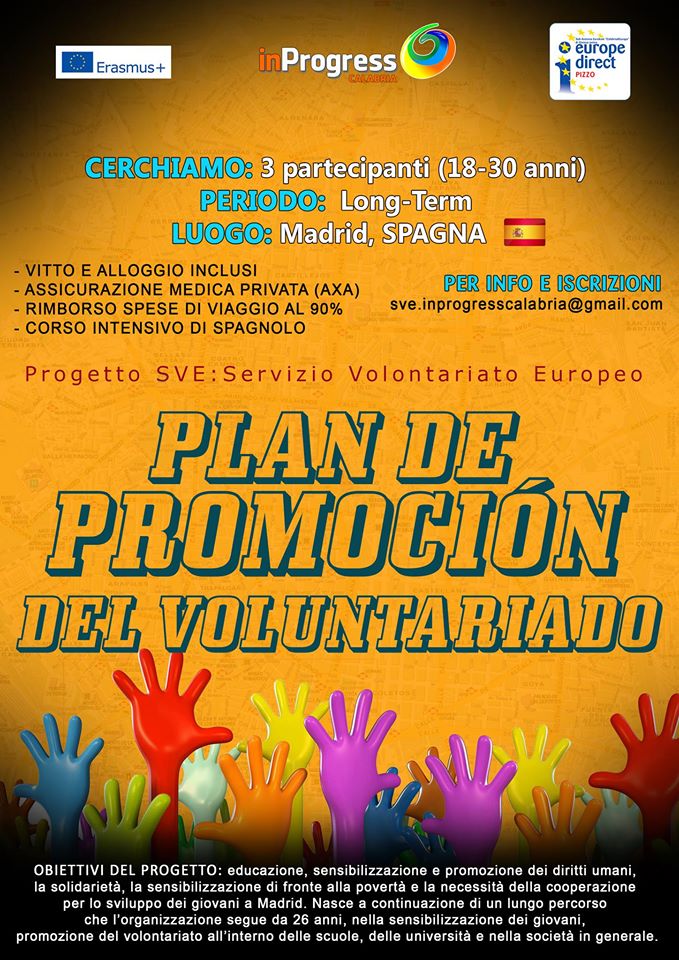 Dopo il grande successo del progetto “PLAN DE PROMOCIÓN DEL VOLUNTARIADO”, l’Associazione In Progress Calabria, in collaborazione con il partner spagnolo, ha deciso di offrire ai giovani italiani, ancora una volta, l’opportunità di vivere un'esperienza di volontariato europeo nella capitale spagnola.